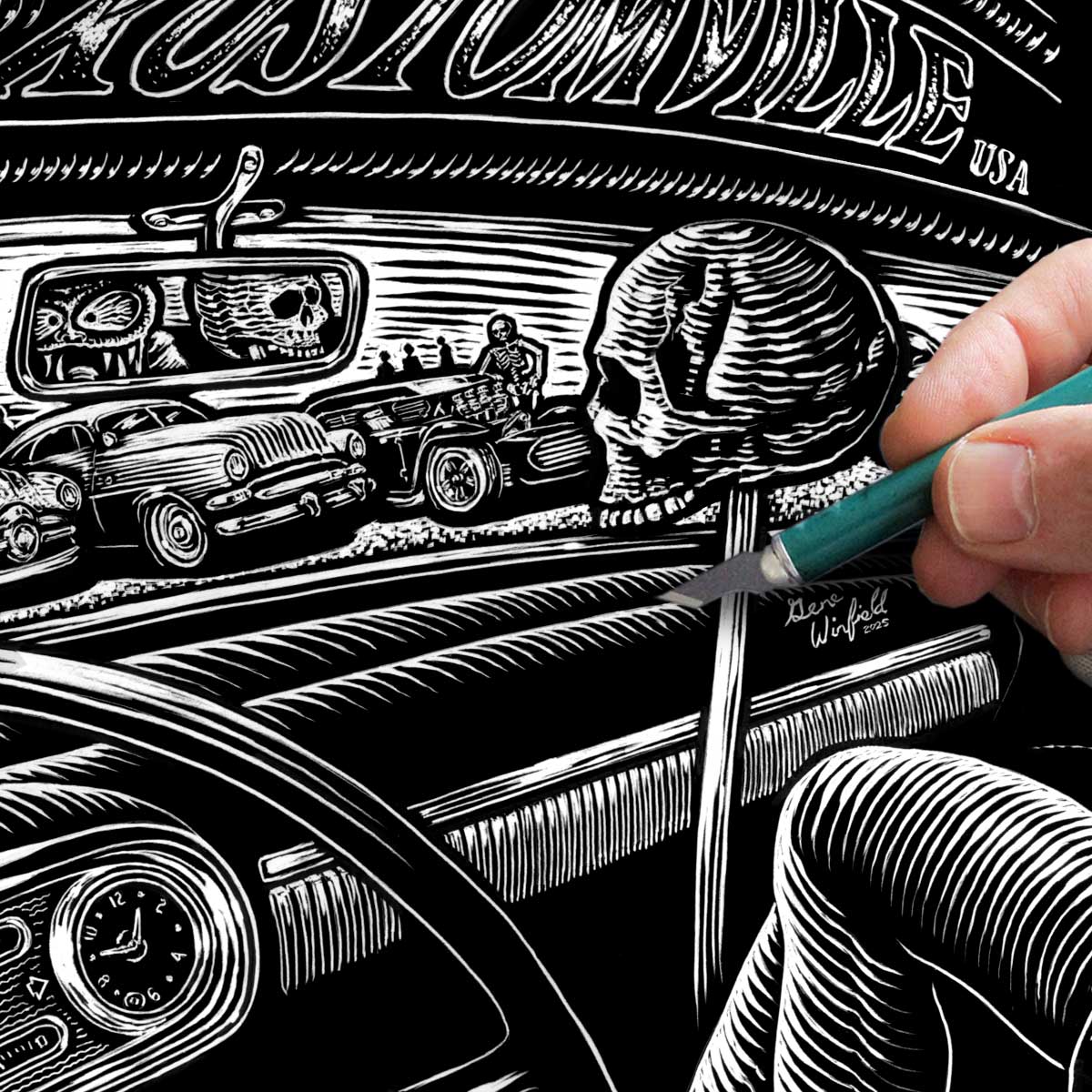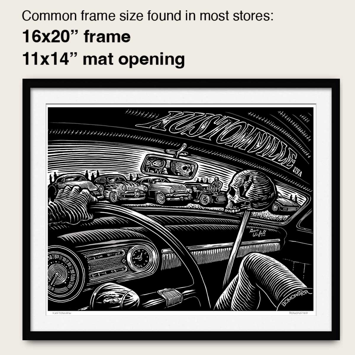 - Limited number printed and numbered in sequence, titled and signed by hot rod scratchboard artist BOMONSTER.