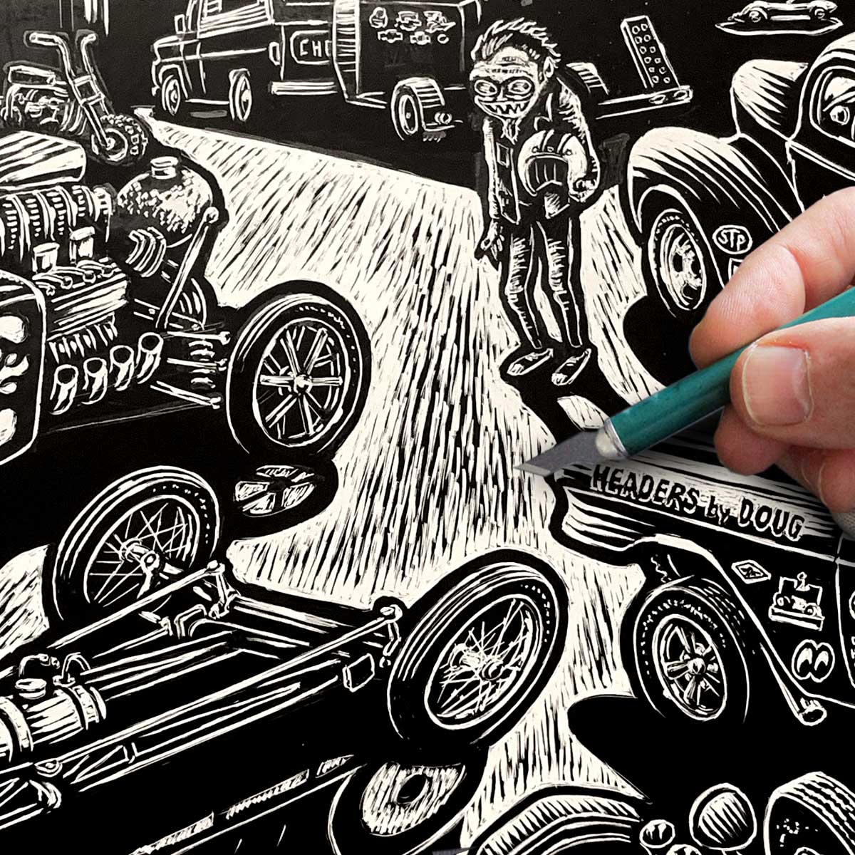 • Limited number printed and numbered in sequence, titled and signed by hot rod scratchboard artist BOMONSTER.
