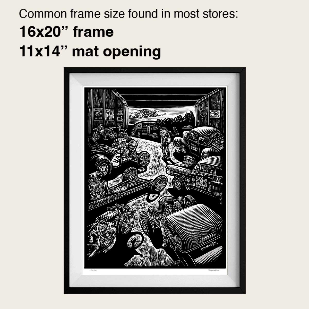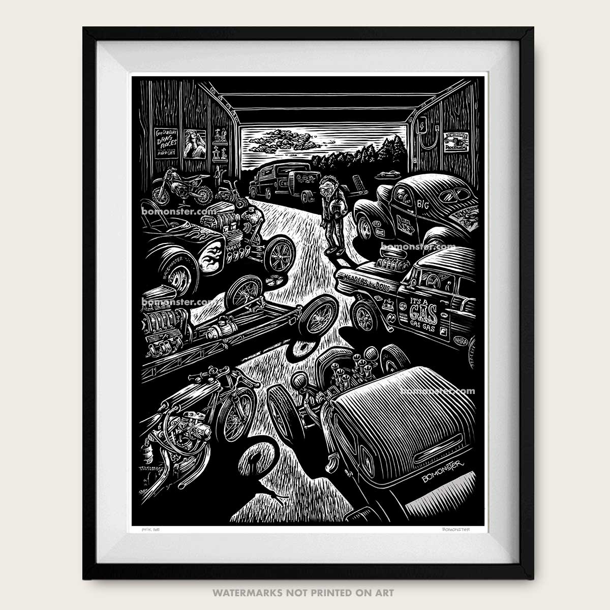 When you have a garage full of hot rods, which one do you pick to go drag racing? This limited edition litho print of an original scratchboard art rendering by hot rod artist BOMONSTER is signed and numbered. It makes a great gift for monster-loving, drag racing, hot rod art fans.