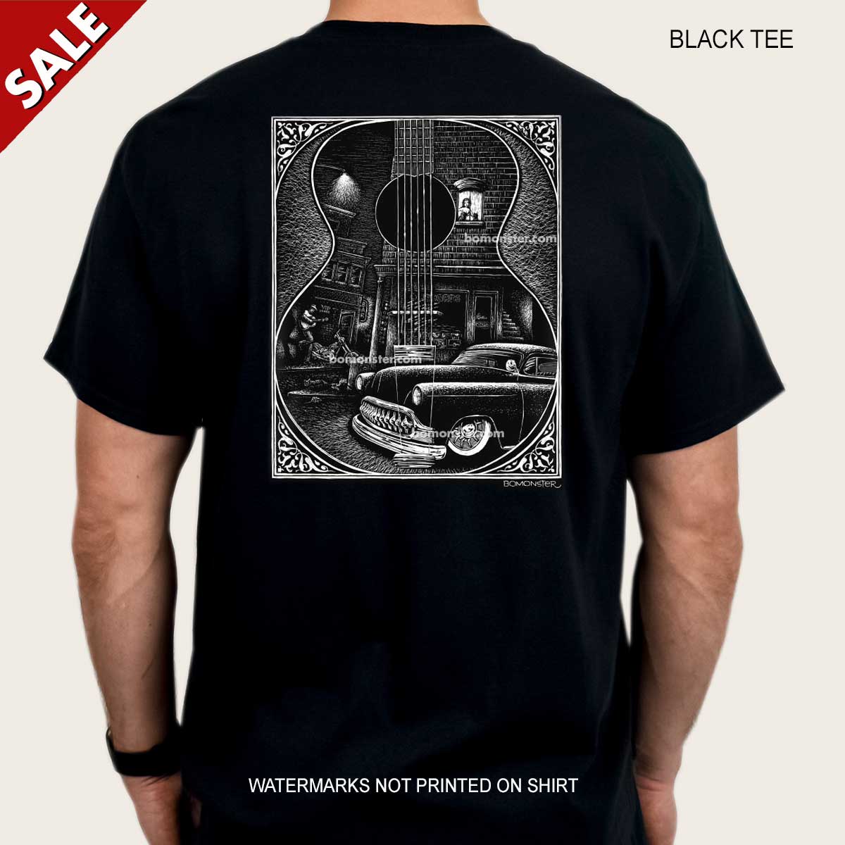 - Night scene of guitarist serenading girl in window. Parked outside is a chopper and custom Chevy coupe.