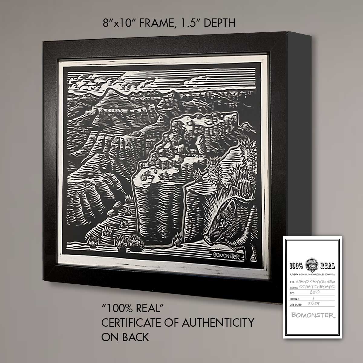 The rugged beauty of the American Southwest through this one-of-a-kind framed BOMONSTER scratchboard original. This highly detailed black-and-white rendering captures the dramatic depth and layered majesty of the Grand Canyon.