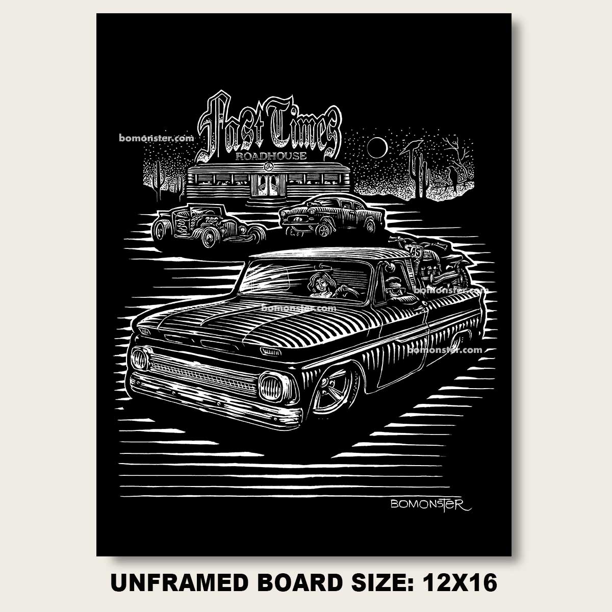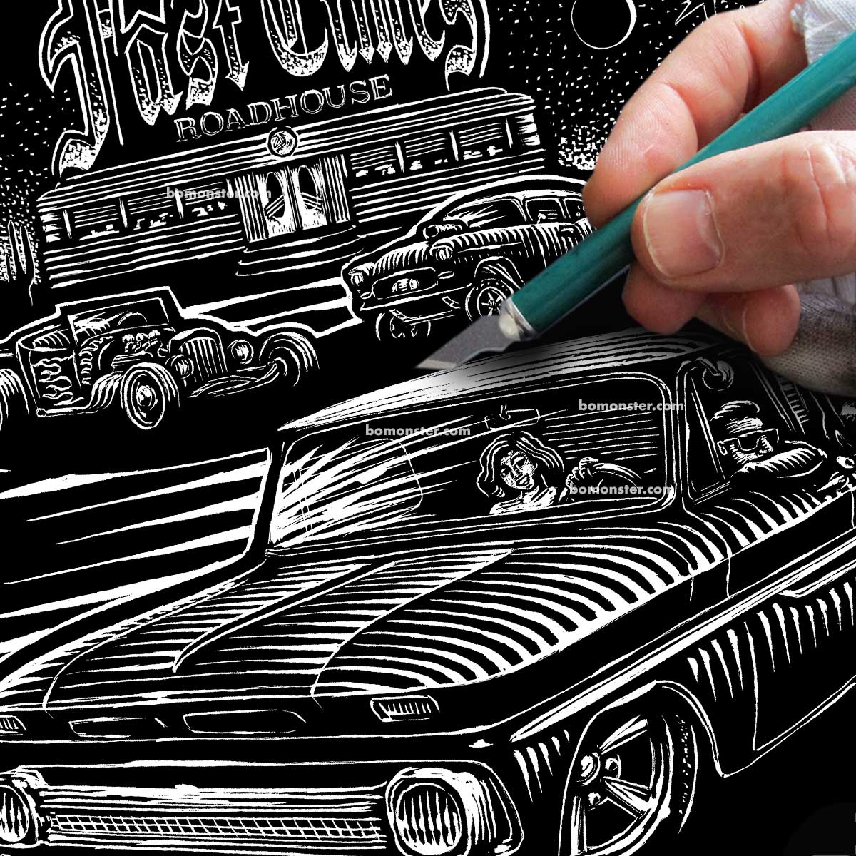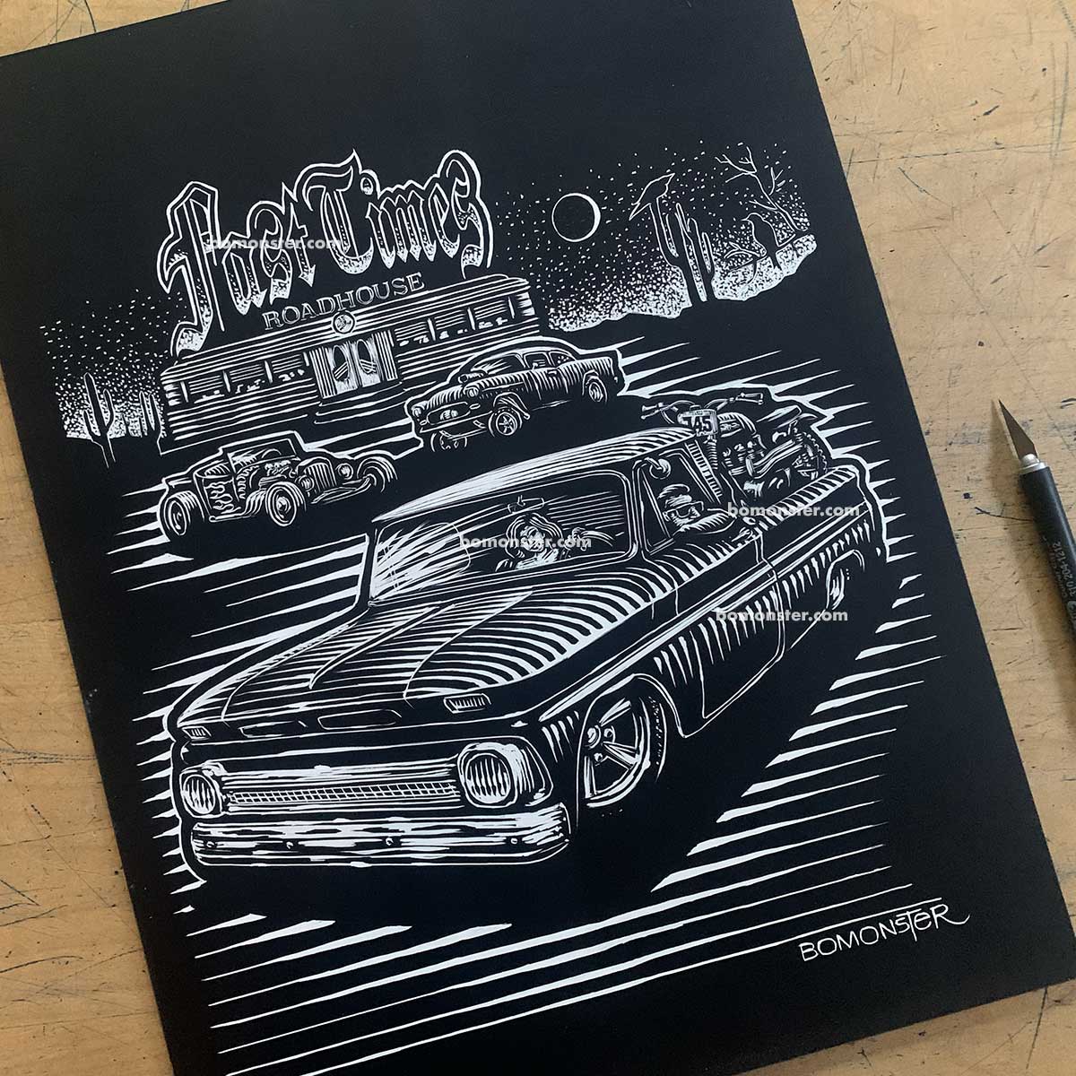 This is the original scratchboard art used to print a limited run of BOMONSTER tees:"Roadhouse" tee