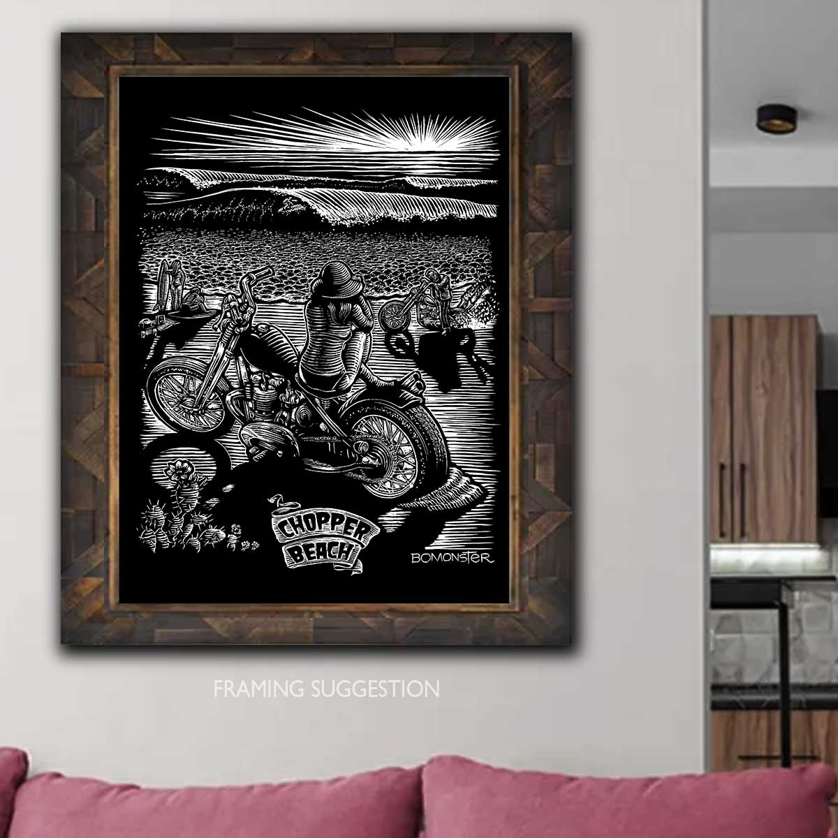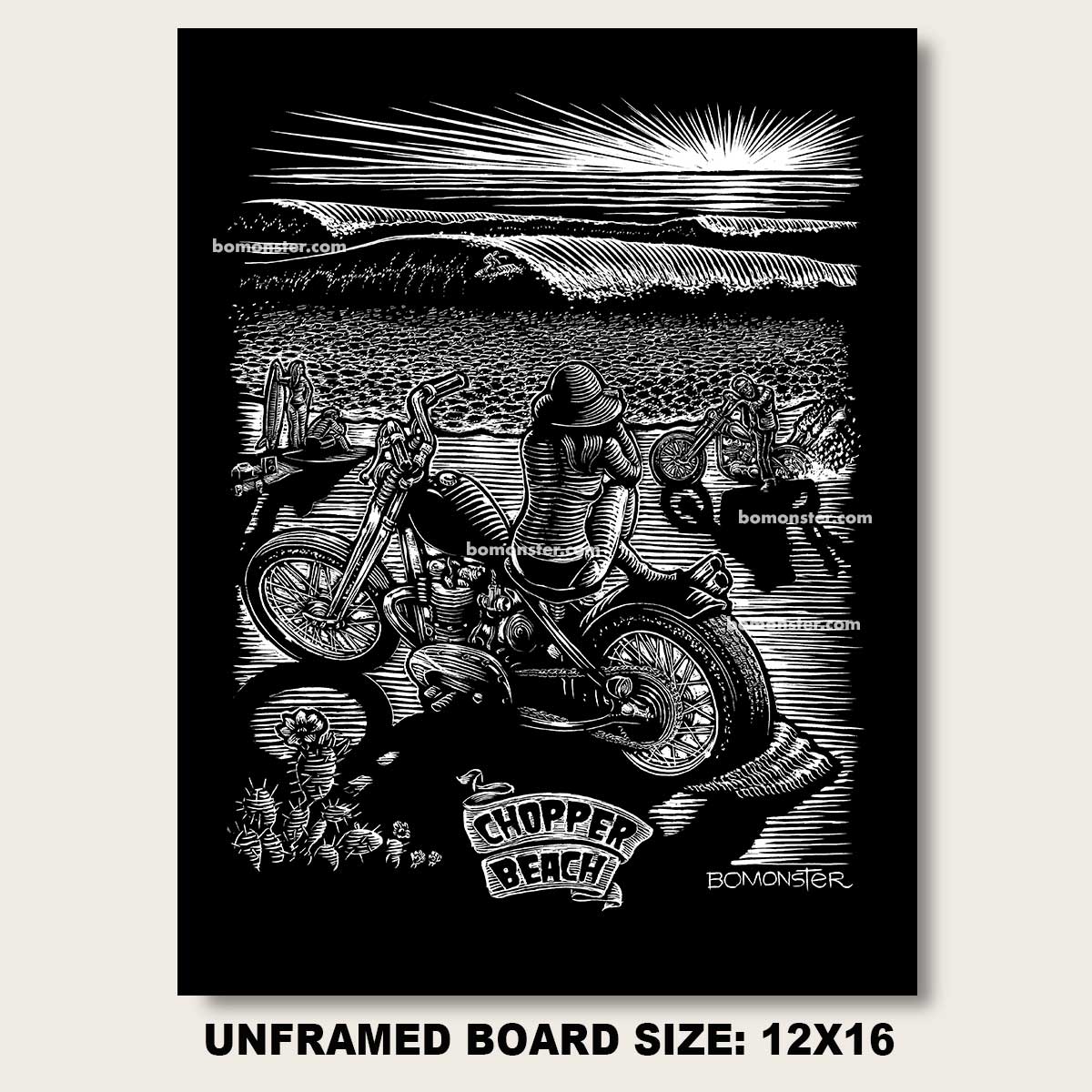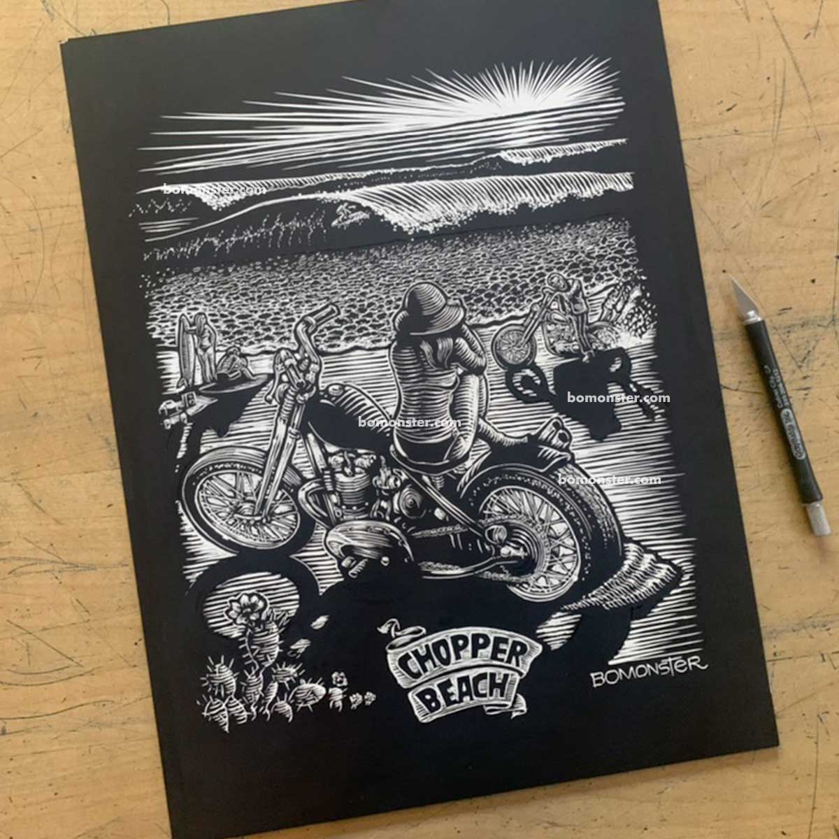 This is the original scratchboard art used to print a limited run of 200 BOMONSTER tees:"Chopper Beach" tee