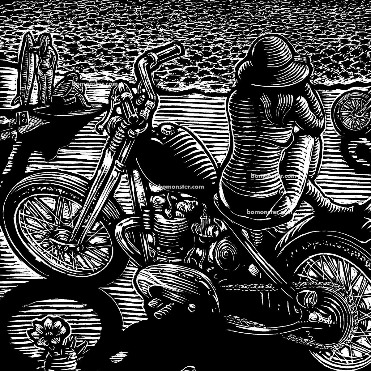 Chopper Beach is a one-of-a-kind original BOMONSTER scratchboard capturing a bikini-clad girl perched on her vintage Triumph chopper, watching a lone surfer carve through distant waves.