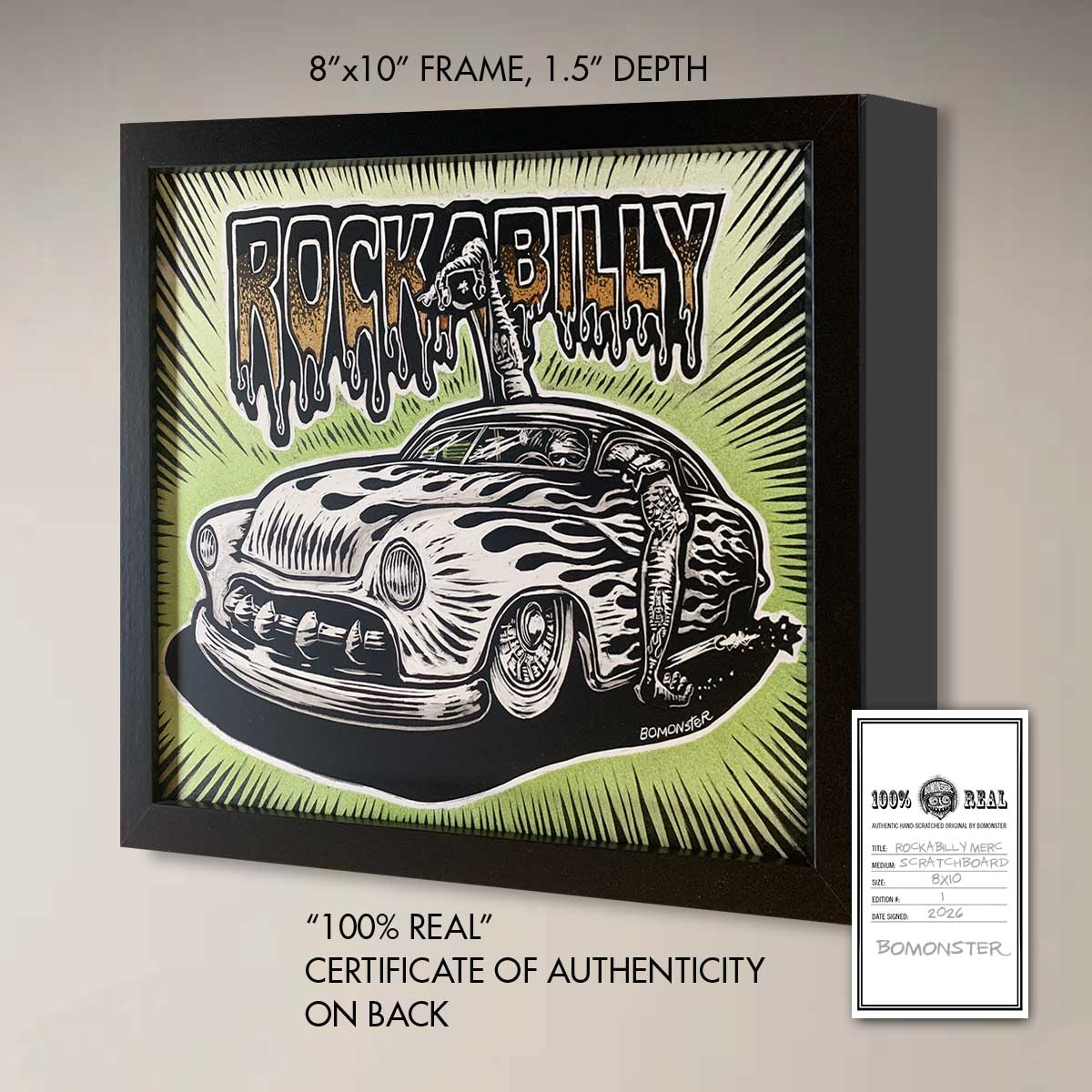 Step into pure rockabilly attitude with this one-of-a-kind original BOMONSTER scratchboard artwork featuring a slammed 1950s Mercury custom dripping in hand-striped flames. A cool beatnik driver hangs his arm out the window, knuckles grazing the pavement in classic kustom kulture style.