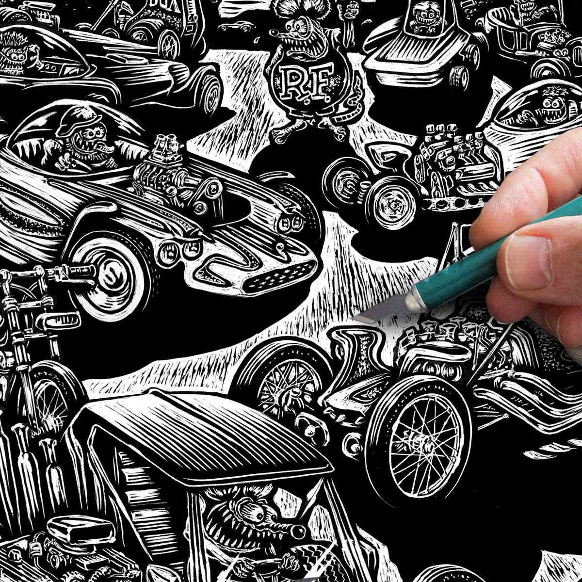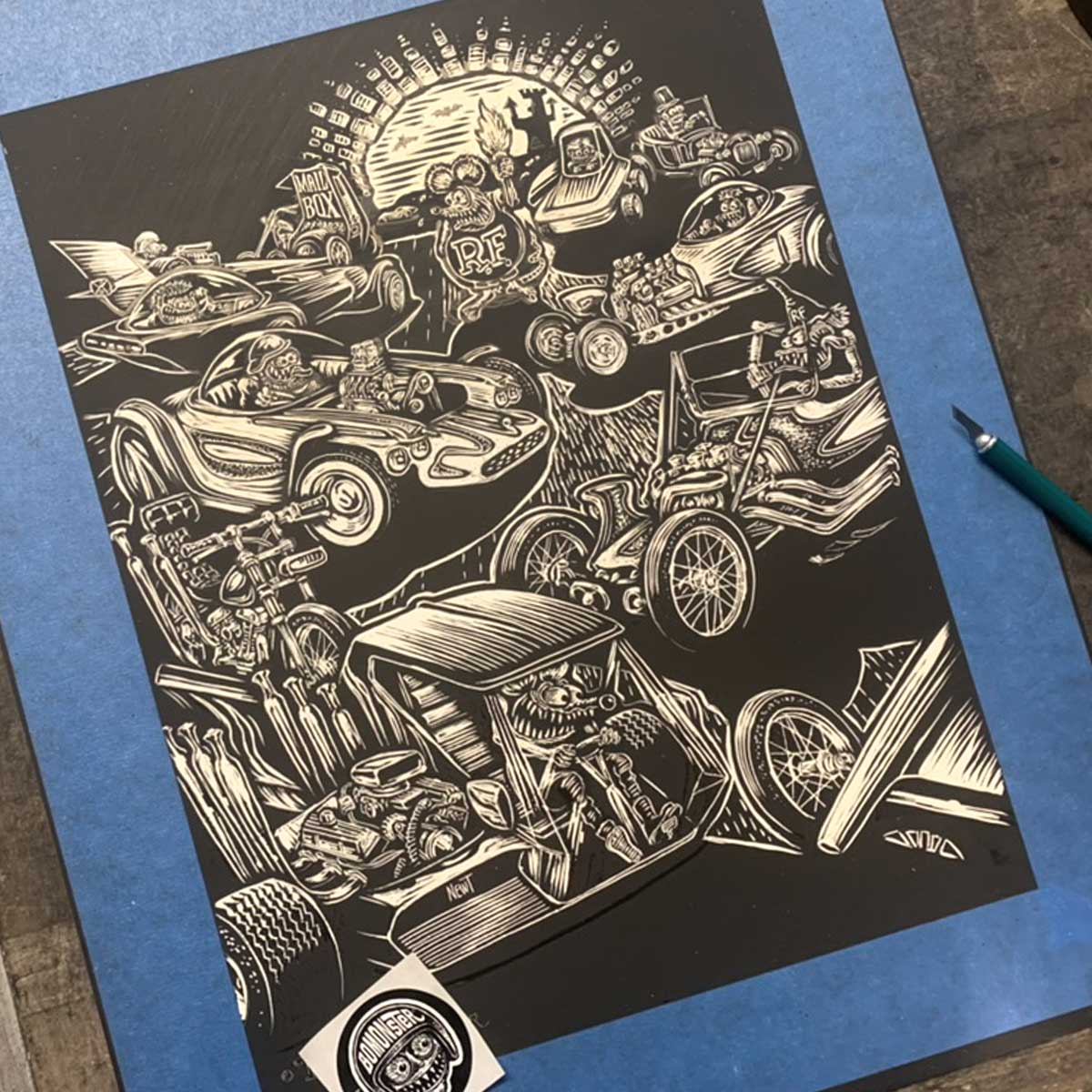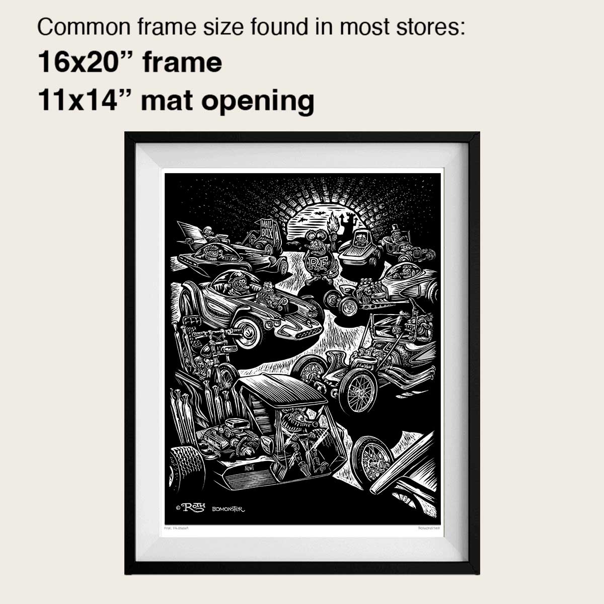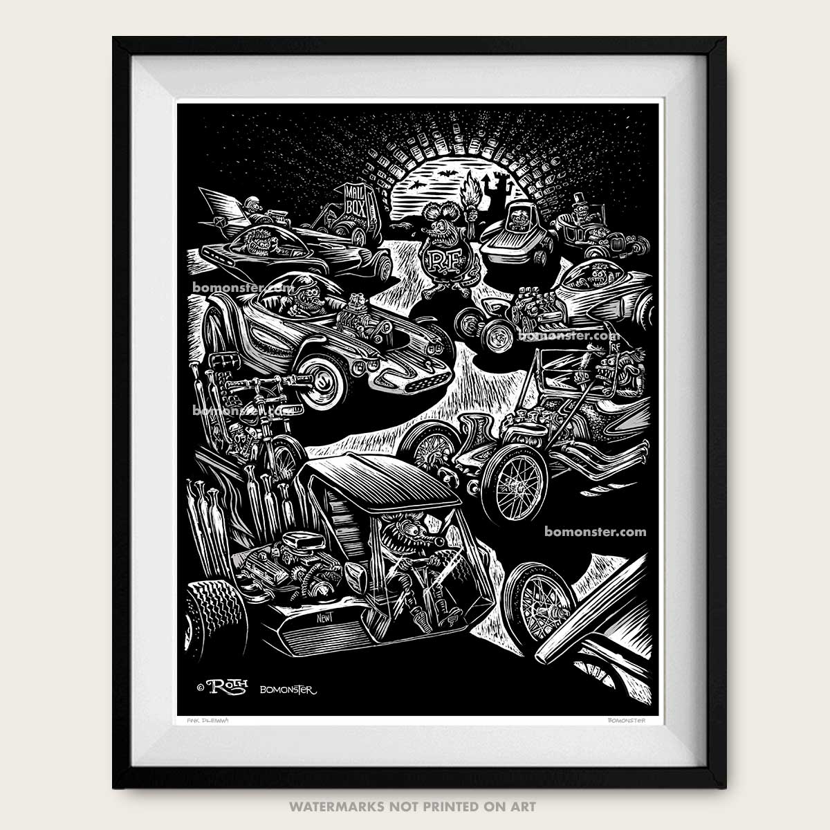 What does Rat Fink drive? Anything made by Ed "Big Daddy" Roth. This limited edition litho print of an original scratchboard art rendering by hot rod artist BOMONSTER is signed and numbered. It makes a great gift for monster-loving, custom show car-driving Kustom Kulture art fans.